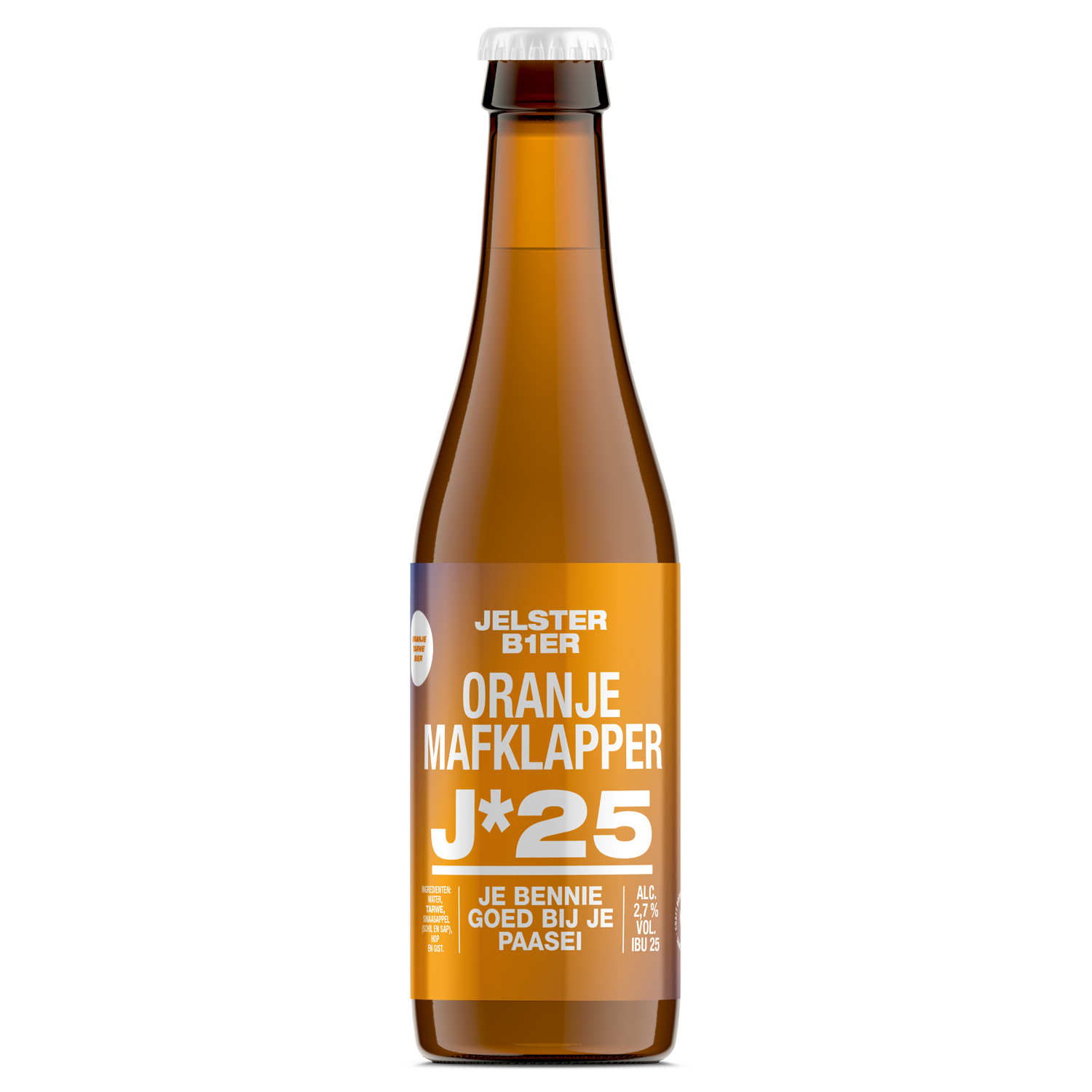Geheel actueel presenteren wij u de oranje mafklapper. Tarwemout, sinaasappelschil en sap en een fruitig gistje. Alleraardigst van smaak en met wat minder alcohol (2,7%). Fijn voor bij de maandagse nasi, wedstrijden van het Nederlands elftal of het acht uur journaal.